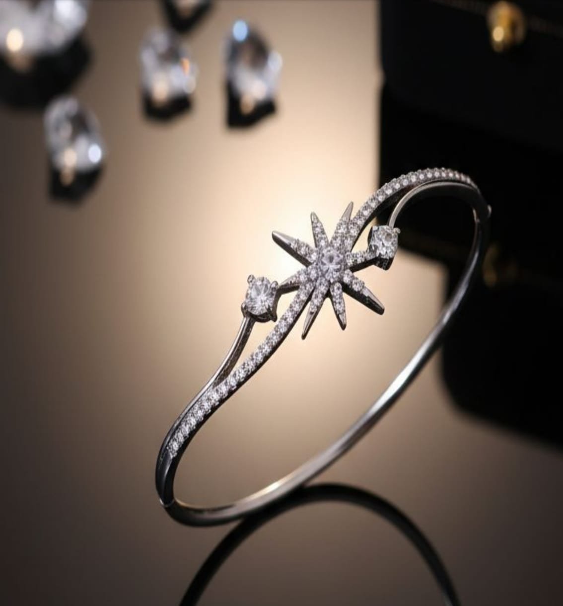Inspired by starlit skies, the Celestial Star Open Bracelet features a dazzling star-shaped motif adorned with sparkling stones. Designed for women who love unique statement jewellery, this bracelet offers a balance of elegance and modern flair. Ideal for parties, date nights, and special occasions.